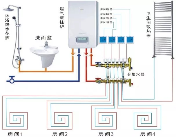 完整的水地暖系統離不開熱源、控制、管道、保溫四大部分。采暖壁掛爐是地暖的熱源中心,滿足地暖整個系統運行所需的熱量;保溫層、反射膜、采暖管道、回填層等地面部分保證系統的保溫效果;分集水器和溫控器維護系統的正常運行。