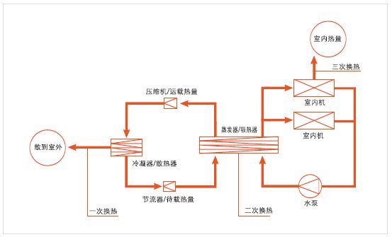 室外機(jī)一般稱(chēng)為冷熱水機(jī)組,室內(nèi)機(jī)一般稱(chēng)為風(fēng)機(jī)盤(pán)管,通過(guò)水管連接。室外機(jī)組產(chǎn)生冷/熱水,用水泵送入每個(gè)室內(nèi)機(jī),室內(nèi)空氣與水換熱達(dá)到溫度調(diào)節(jié)的目的。