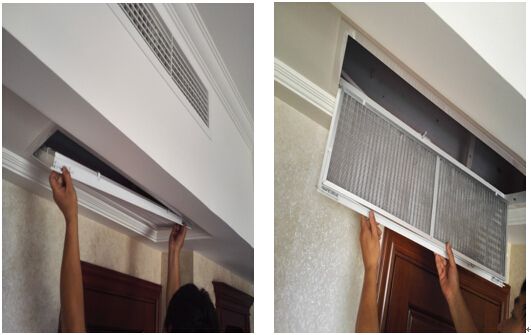 從出風口和回風口處取下的過濾網,要用水沖洗至潔凈,可用小刷子搭配清潔劑仔細清潔。將清洗好的過濾網放在背光處晾干,然后將過濾網重新裝回出風口,面板在吊頂上固定好,恢復風口原狀。