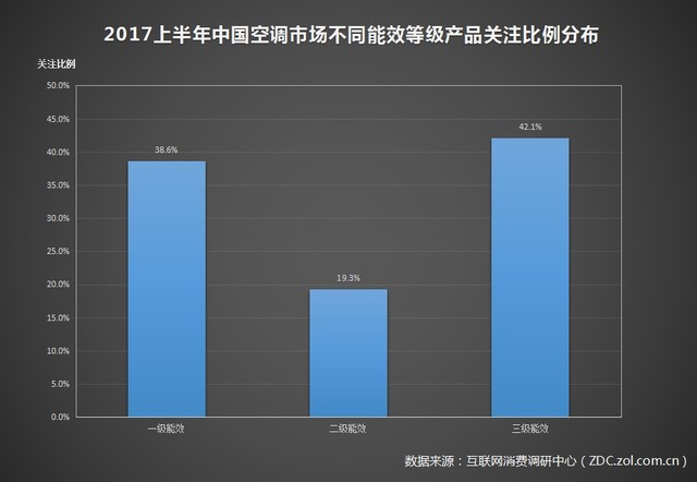 一級能效與三級能效呈現出兩極分化的態勢,三級能效以42.1%的關注占比奪魁,與之相差3.5個百分點的一級能效則以38.6%的關注占比位列第二。關注比例僅為19.3%的二級能效空調排名第三。